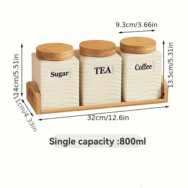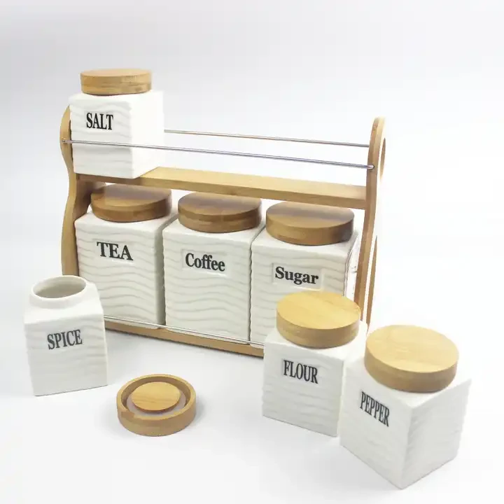 Ensemble de 7 pots de rangement en céramique pour sucre, thé, café et couvercle en bois