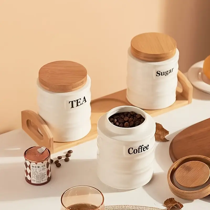 Ensemble de 7 pots de rangement en céramique pour sucre, thé, café et couvercle en bois