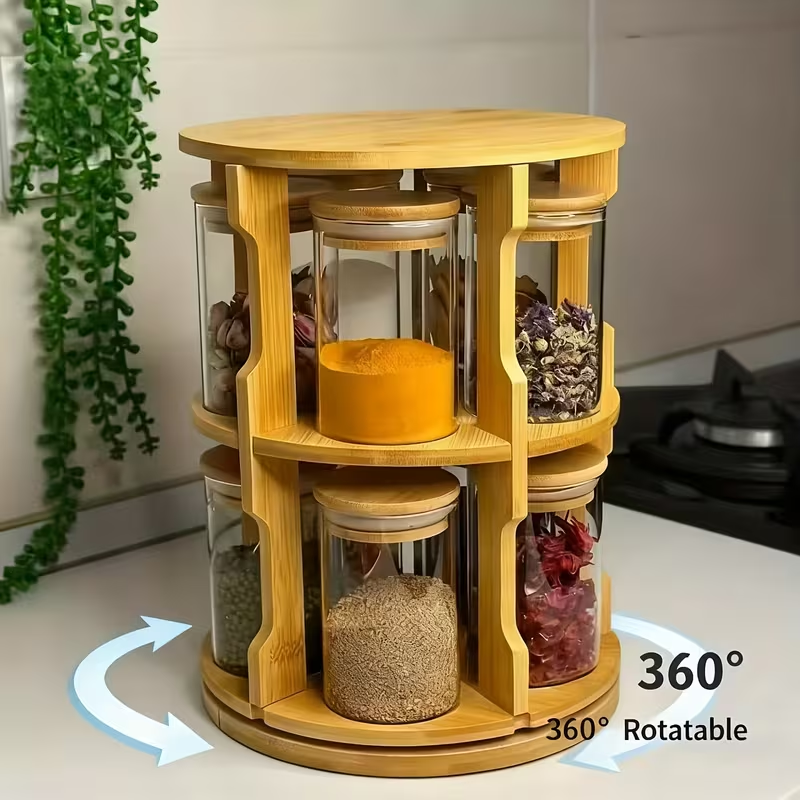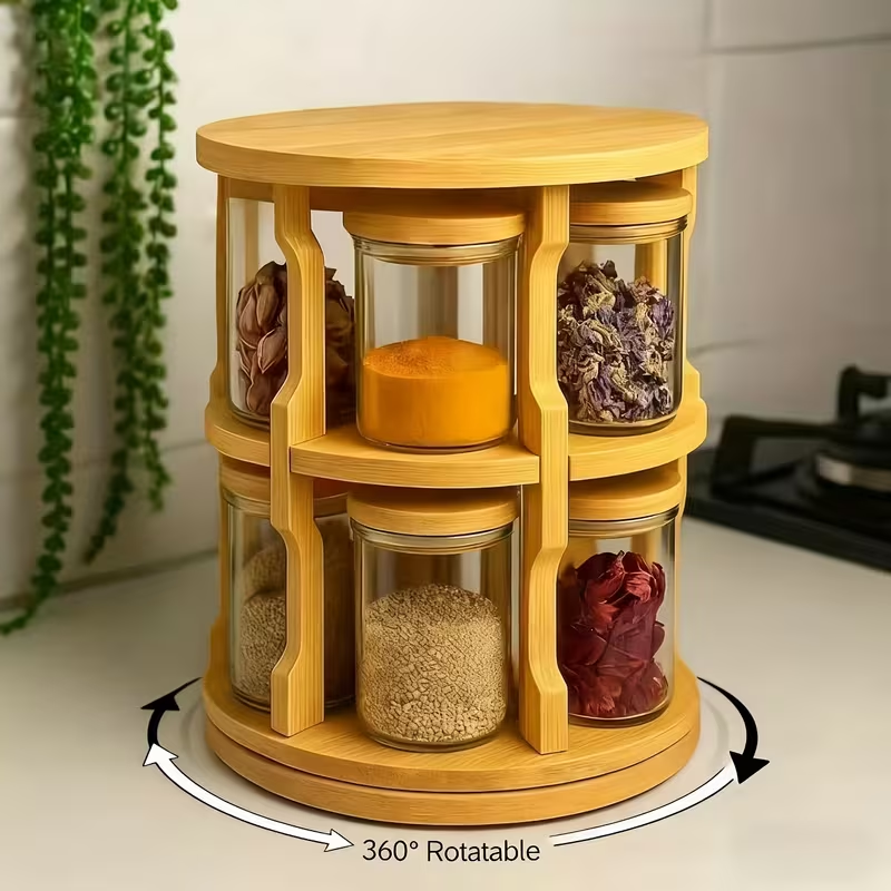 Étagère à Épices en Bambou avec Plateau Rotatif - 10 Pots à Épices en Verre à Couvercle Bambou