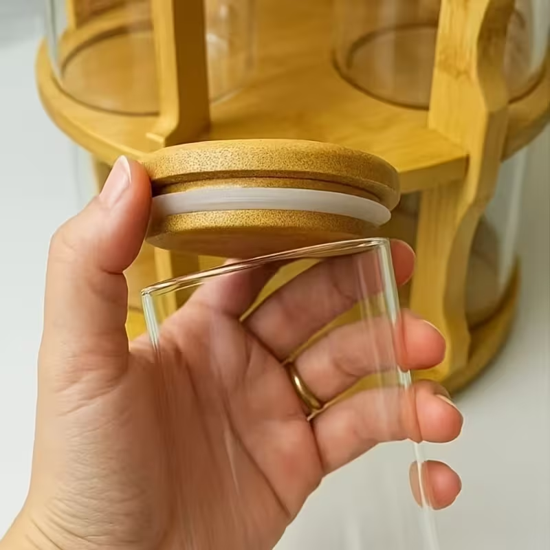 - Contenanace du paquet: 1 Support en Bambou + 10 boites à épices en Verre à Couvercle Bambou