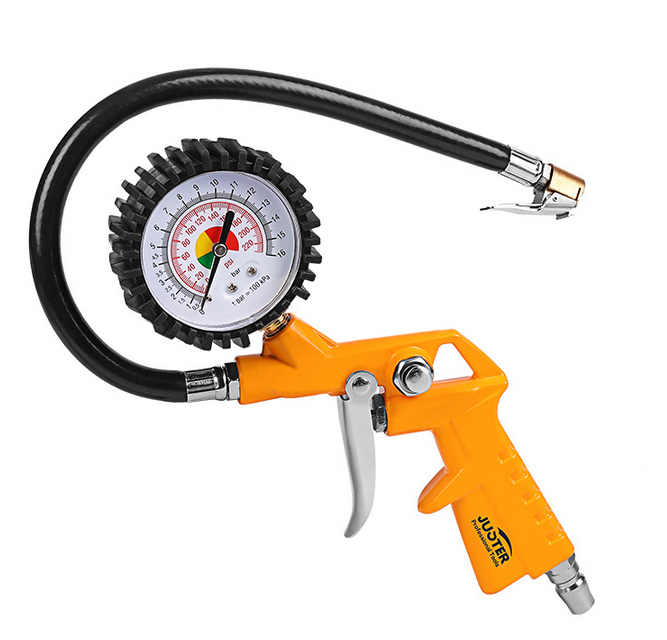 Pistolet de gonflage pneumatique JUSTER avec Corps en plastique durable de poignée de confort et manchon antidérapant sur la gâchette La jauge a un couvercle en caoutchouc protecteur Diamètre de la jauge: 63,5 mm - Longueur du boyau - 350 mm / 13,8 pouces et plage de pression 0-220 psi , 0-16 bar .Généralement Juster Pistolet de Gonflage pneu – LA041 poses d'un cadran taille 63 MME, un cadran poids 87G, Poids Net de 320G, Chuck en cuivre et un corps du Surface de pulvérisation.Ainsi , il convient pour: Vélo Pneus, Pneus De Voiture, Moto Pneus, Tricycle Pneus, Football, Basket-Ball, Gonflable Bateau, Air Lit, Ballon