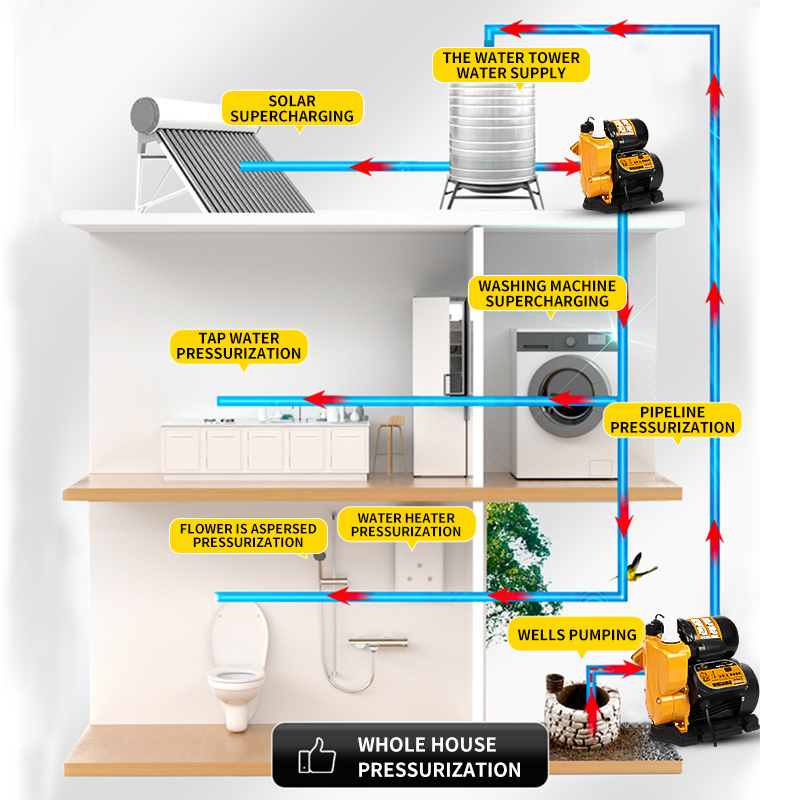 La pompe de surpression automatique de 100 W peut être utilisée pour augmenter la pression de l'eau pour la maison, la salle de bain, la machine à laver, le système d'arrosage, le système d'irrigation et le système d'osmose inverse (RO).