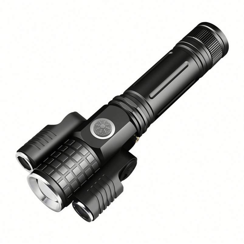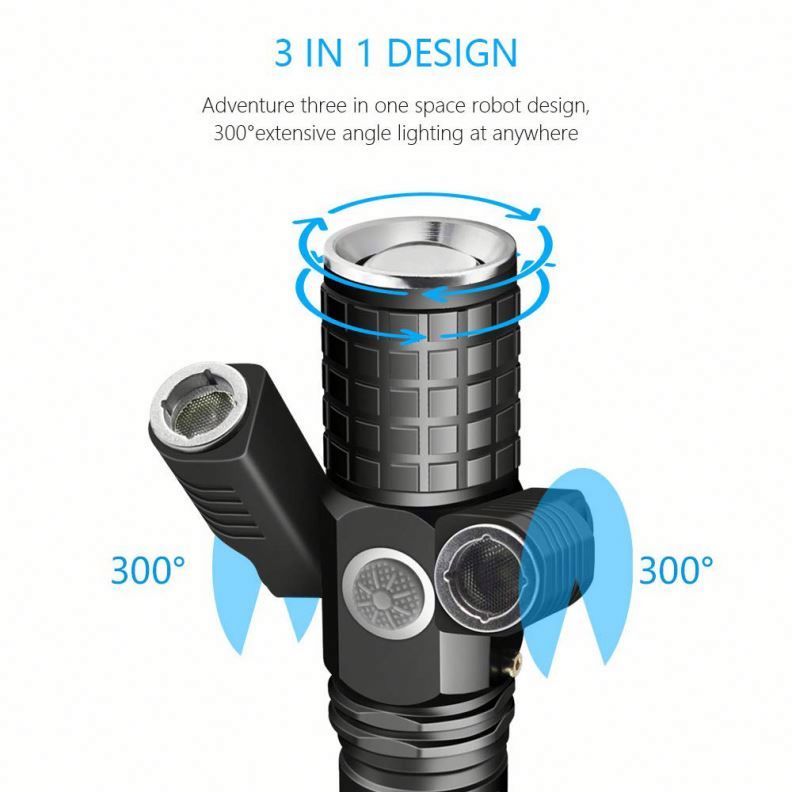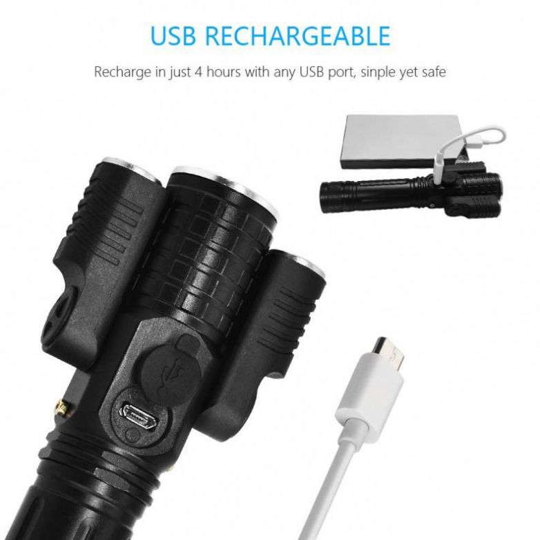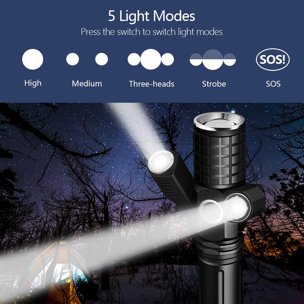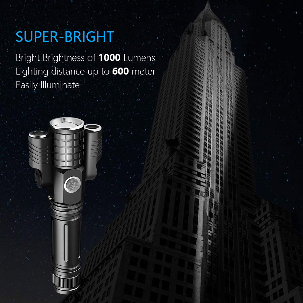 Design avancé : mise à niveau de trois ampoules dans une lampe de poche LED, composée d'une lumière principale et de deux ampoules auxiliaires (XPE), qui peuvent être tournées à 300 degrés pour un éclairage à angle étendu, observation jusqu'à 600 mètres.Super luminosité : 1000 lumens (max) Cree LED rend notre lampe de poche 10 fois plus lumineuse que les anciennes lampes de poche à incandescence, le faisceau ultra large illumine sans effort toute une pièce ou un jardin. Dure facilement pendant tout un voyage de camping.4 modes et fonction zoom : haut, moyen, bas et stroboscopique, 4 modes au choix. Mise au point réglable pour une portée proche ou longue et un faisceau étroit ou large. Fonctionne comme un projecteur qui projette un faisceau de lumière intense jusqu'à 600 mètres devant vous ou un petit projecteur compact qui éclaire une large zone.